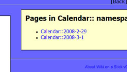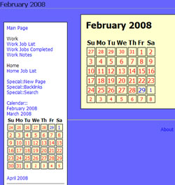Coincidentally, whilst thinking that I should start to organise myself both here and at work a friend of a friend posted a bit about wiki on a stick (it's a wiki on, well, a stick... oh read his is if you want more details!). Perfect, just what I need, except, it doesn't appear to have any calendar features (that I can see, and it has been known for me to miss the complete and utter obvious on more than one occasion...). So, in true work avoidance style, I set to creating my own.